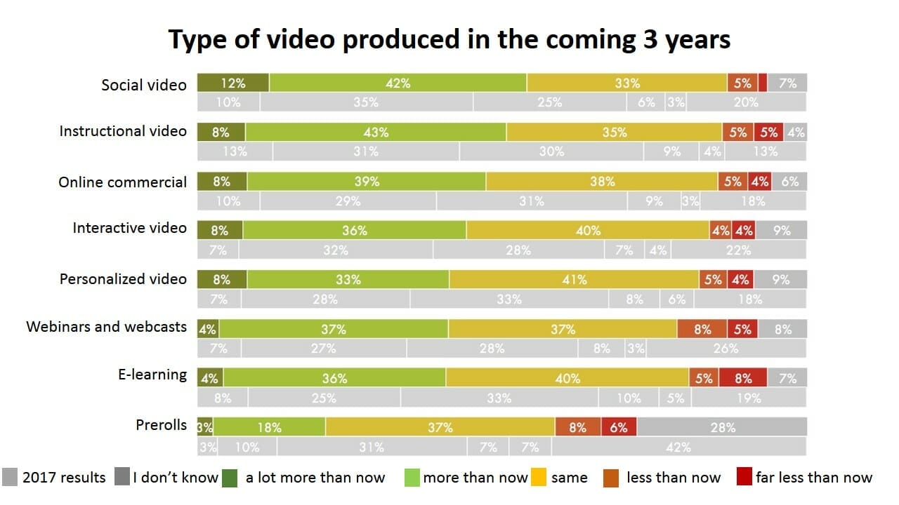 The more traditional video types; webinars and E-learning are quite static indicating that they have settled and no big changes are expected in the future.